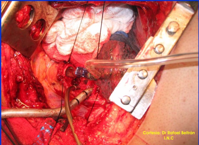 Momento en que se fija la sonda de nelaton al ojo de Murphy del tubo orotraqueal que se encuentra por encima de la lesión (Robertshaw). Esto sirvió de guía para el cambio de doble luz a luz única armado